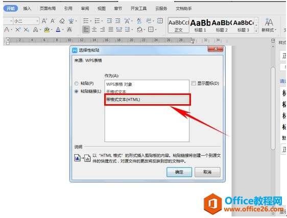 弹出选择性粘贴,选中粘贴链接,选择带格式文本(HTML),代表着粘贴链接将创建一个到源文件的快捷方式,对源文件的更改将反映到现有文件当中。单击确定。
