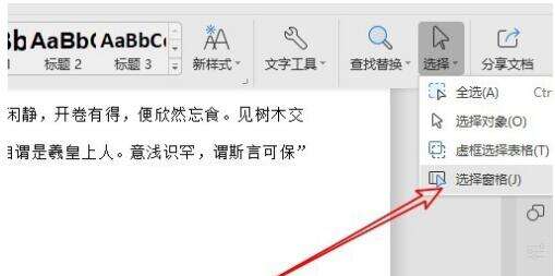 在弹出的选择下拉菜单中选择“选择窗格”菜单项。
