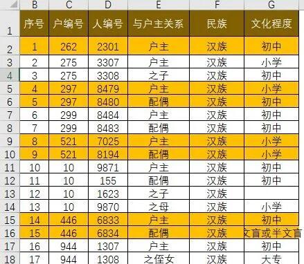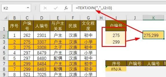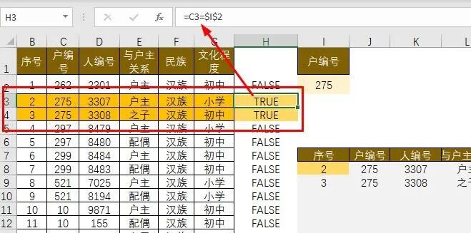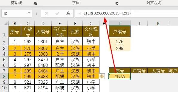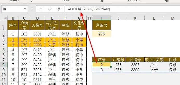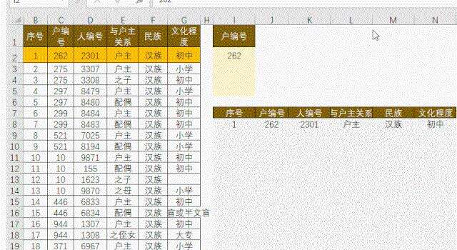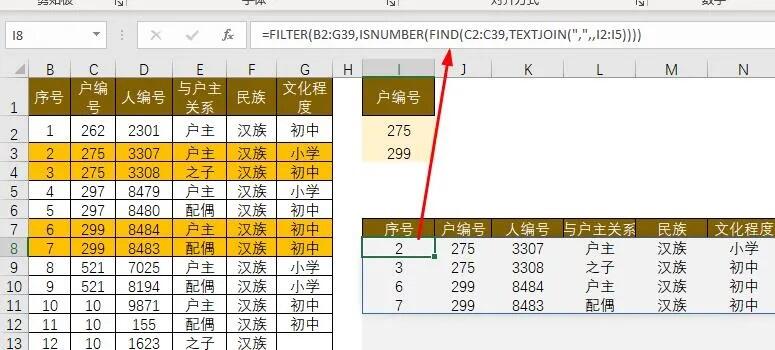 问题来了:根据i列户编号,从左表中查找出该编号的所有家庭成员,而且是同时查找多个户编号。