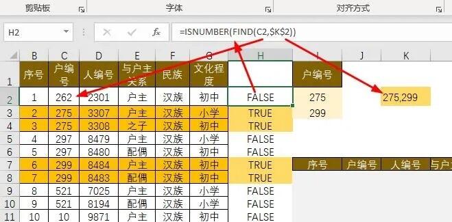 然后再进行用isnumber+find函数组合逐一对比是C列的编号是否包含在合并的户编号中。