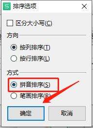 4.接着来到自定义排列的窗口,将里面的关键词选择为姓名,并选择右上角的选项按钮,在对话框中勾选拼音排列选项,按下确定