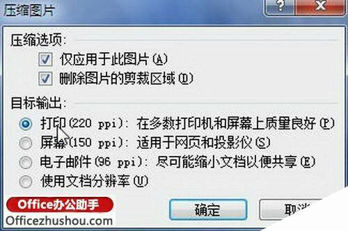 第3步,打开“压缩图片”对话框,选中“仅应用于所选图片”复选框,并根据需要更改分辨率(例如选中“Web/屏幕”单选按钮)。设置完毕单击“确定”按钮即可对Word2010文档中的选中图片进行压缩,如图所示。
