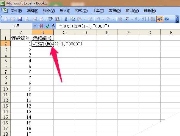 在B2单元格输入“=TEXT(ROW()-1,"0000"),按 Enter回车确认输入。