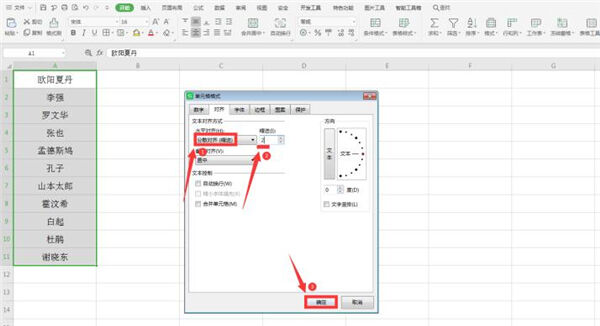 在【对齐】选项下,“水平对齐”选择“分散对齐(缩进)”,“缩进值”根据情况填入,我们这里输入“2”: