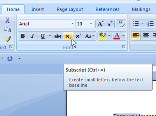通过按Ctrl + =(等于)或单击“下标”按钮使文本下标。下标文字显示在该行下方,例如H2O中的2。