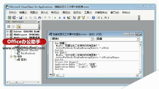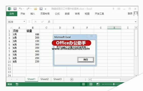 2、将插入点光标放置到dingyi过程中,按F5键运行该过程定义快捷键。切换到Excel窗口,按Ctrl+←键将运行名为“隐藏”的Sub过程,弹出提示对话框,提示隐藏图表,如图2所示;按Ctrl+→键将运行名为“显示”的Sub过程,弹出提示对话框,提示显示图表,如图3所示。