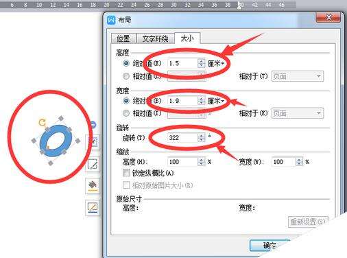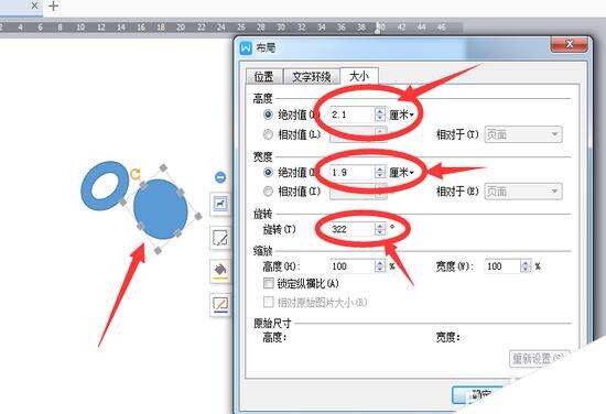 3、画烟斗部分。我们使用插入——形状中的【圆形】画出一个圆形,然后设置大小,【高度】设置为2.1,【宽度】设置为1.9,【旋转】角度设置为322度。设置好后如下图。