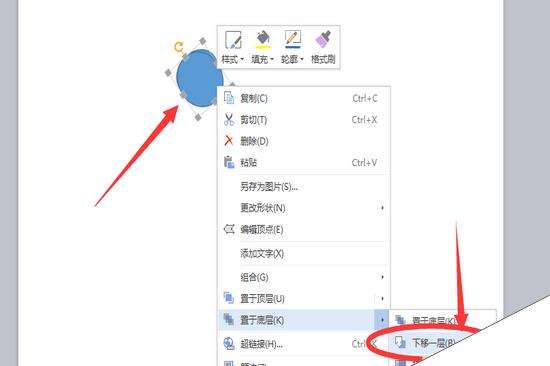 4、对烟斗部分进行微调。先将设置好的烟斗放置到如下图的位置,这时我们看到,烟斗出现在了烟口的上方,这时我们需要在烟斗上点击鼠标右键,在弹出的快捷菜单中,选择【置于底层】——【下移一层】将烟斗调整到烟口的图层下方,如下图。