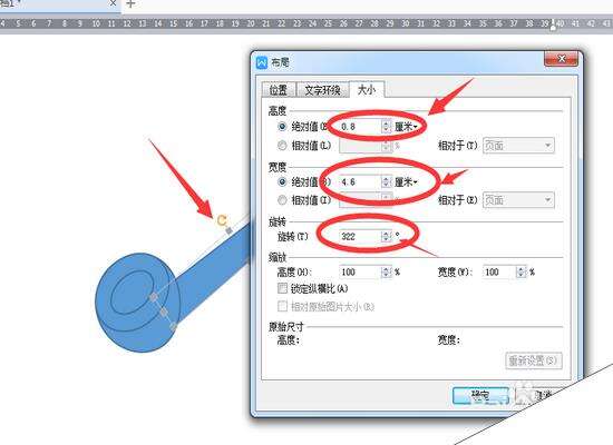 2、设置烟口的大小和角度。在图形上点击右键——其他布局选项——大小,在下面的【高度】中设置1.5,【宽度】设置1.9,【旋转】角度设置为322度。设置好后如下图。
