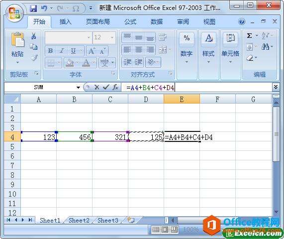 4、在单元格中继续输入运算符号“+”然后单击C4单元格,之后再次输入运算符号“+”,并单击D4单元格,此时单元格内显示的公式“=A4+B4+C4+D4”,如图4所示。