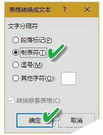 在弹出的“表格转换成文本”对话框中,勾选“制表符”一项,然后点击“确定”完成转换。