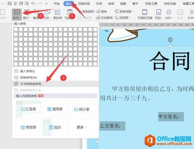然后在工具栏中点击插入,点击表格,然后在下拉列表中点击文本转换成表格: