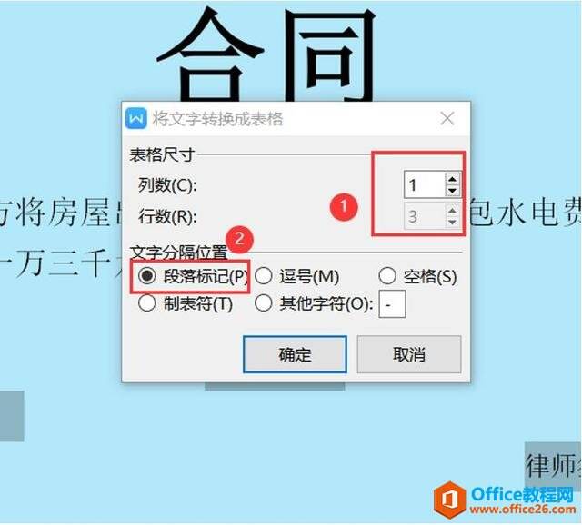 在弹出的对话框中,我们修改表格尺寸和段落标记,然后再点击确定: