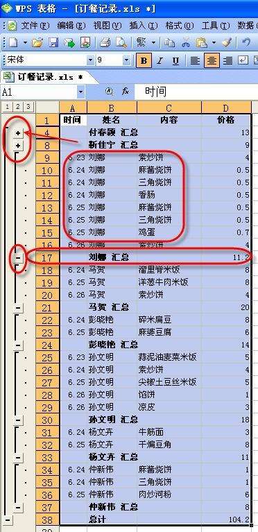 名称汇总后,有些条目前面没有了日期,这实际上是我只做表格的一个缺陷,没有充分认识到软件和人思维区别。我们可以想当然认为在新时间开始前都是上一天,但软件不会这样,我应该在每一个条目上都补上日期,这样可以让每个人知道那天都选择的什么饭菜。