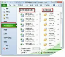 2.、切换到“最近所用文件”视图中,在该视图中可以看到,在“最近使用的工作簿”及“最近的位置”区域中已经记录了最近使用的Excel工作簿及最近访问的文件夹,如图2所示。