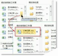 3、在“最近使用的工作簿”区域中找到曾经打开过的“订单记录”工作簿,然后单击其右侧的“图钉”状按钮,即可将其固定在列表中,如图3所示。