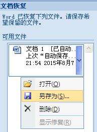 3、选择需要恢复的文件,从右侧的倒三角箭头下拉菜单中选择“另存为”命令,一般选择替换为原有文档即可保存退出Word时未保存的文档。