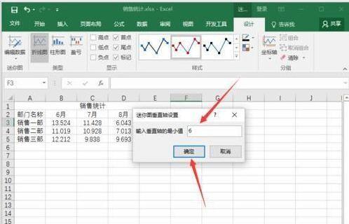 6、点击自定义值命令选项后,这个时候会弹出一个“迷你图垂直轴设置”对话框,在“输入垂直轴的最小值”文本框中输入“6”,然后单击“确定”按钮。如图所示;