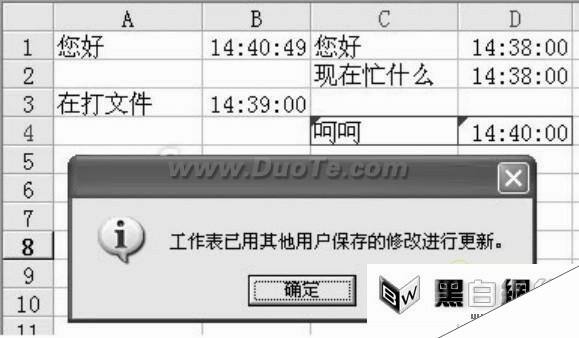 提高效率,多人同时录入一个Excel文件这个应用主要利用了Excel的“允许多用户同时编辑,同时允许工作簿合并”功能,在实际工作中,可以用做多人共同录入一个Excel表格,Excel会自动保持信息不断更新。比如:有A、B、C、D四个用户分工合作共同完成2005.xls文件的录入,首先打开这个文件,并按上面的操作勾选“允许多用户同时编辑,同时允许工作簿合并”,最后点击“文件→另存为”,将其保存在E电脑的D盘中。接下来四个用户就可以同时在这个文件中录入了。