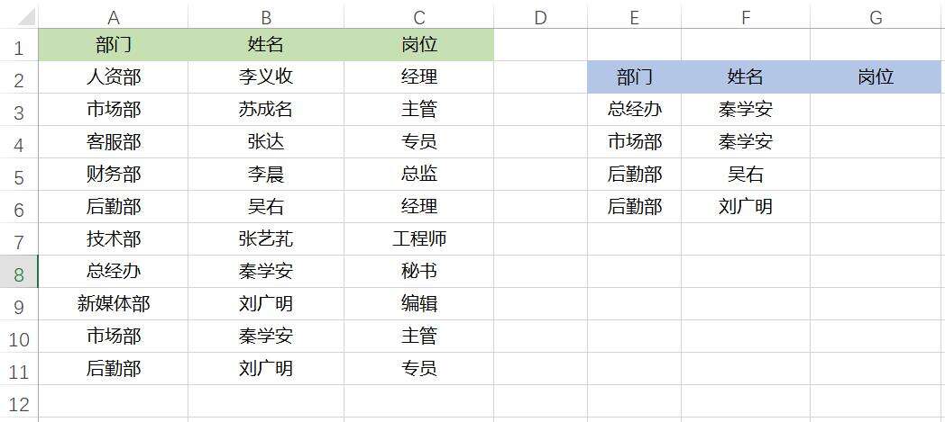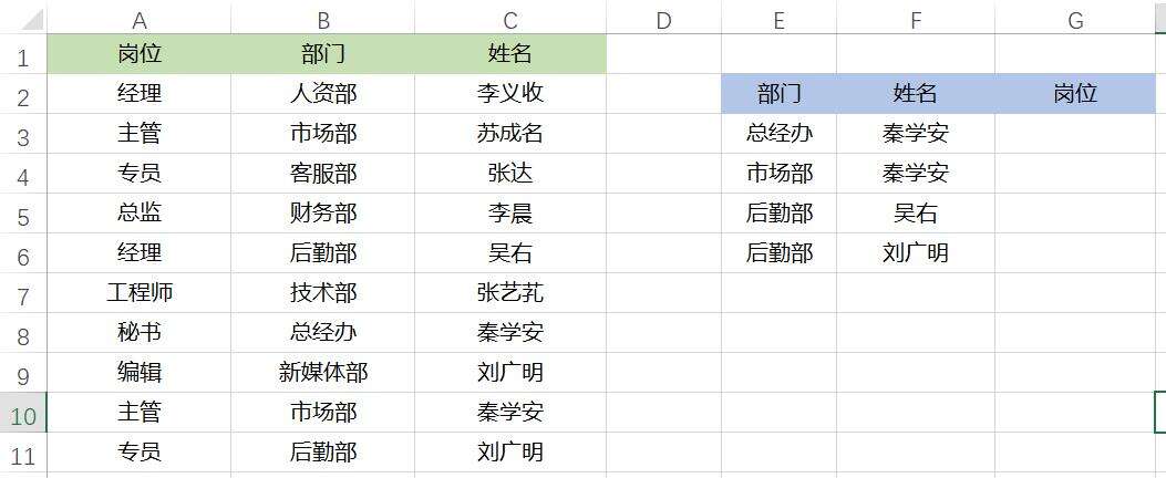 查询下面部门与姓名对应的岗位的名称。