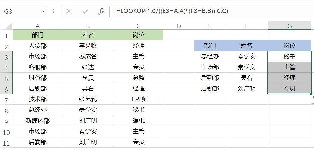 在G3单元格中输入公式:=LOOKUP(1,0/((E3=A:A)*(F3=B:B)),C:C),按Enter键后向下填充。