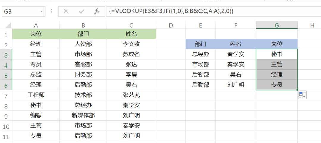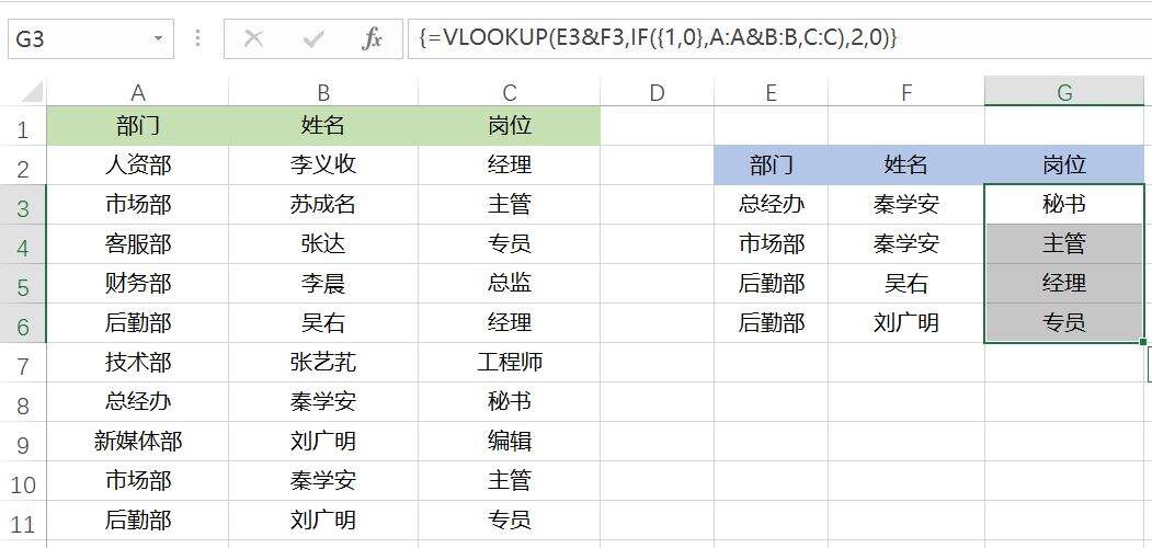 {=VLOOKUP(E3&F3,IF({1,0},B:B&C:C,A:A),2,0)},按组合键后向下填充。