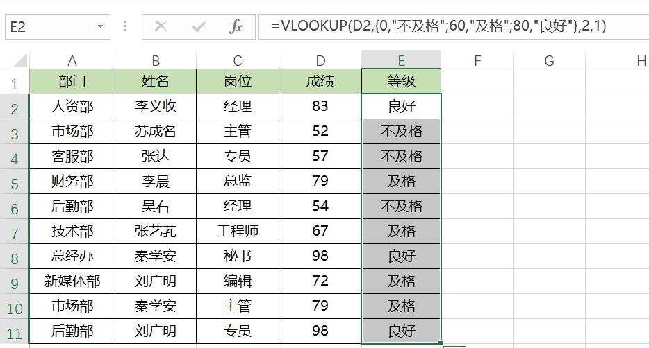 =VLOOKUP(D2,{0,”不及格”;60,”及格”;80,”良好”},2,1),
