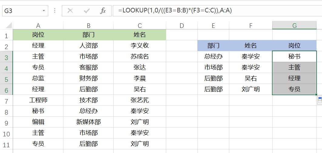 在G3单元格中输入公式:=LOOKUP(1,0/((E3=B:B)*(F3=C:C)),A:A),按Enter键后向下填充。