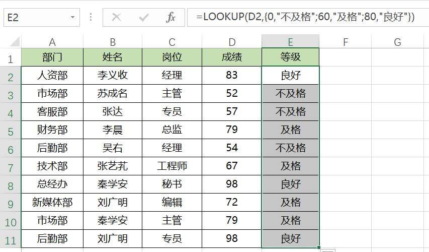 =LOOKUP(D2,{0,”不及格”;60,”及格”;80,”良好”}),