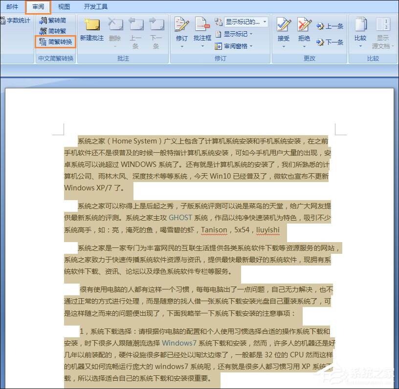 2、单击“审阅”选项卡,单击“简转繁”按钮,转换后的效果如下;