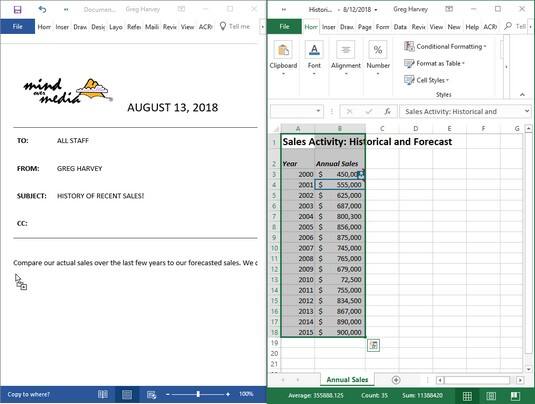 当您越过Excel和Word程序窗口之间的边界时,鼠标指针的形状更改为国际“ oh-no-you-don’t”符号。但是,当您到达Word文档区域的安全港时,指针再次发生了变化,这一次是箭头的形状从带有加号的框中伸出来。(说明的方式是什么?)要指示在Word文档中的哪个位置嵌入所选数据,只需将箭头从一个带有加号的框粘贴起来,将指针放置在文档将显示Excel内容的位置。然后,释放鼠标按钮。上面的第二张图片显示了释放鼠标按钮后出现的嵌入式工作表。