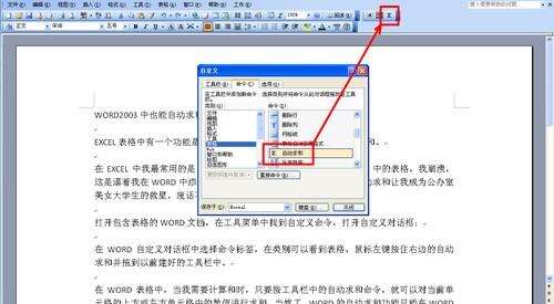 在WORD“自定义”对话框中选择“命令”标签,在类别中可以看到表格,鼠标左键按住右边的自动求和并拖到以前建好的工具栏中。