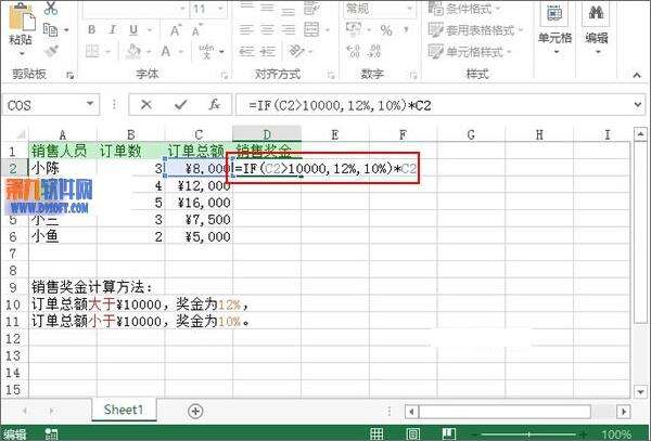 ②在D2单元格输入: =IF(C2>10000,12%,10%) ,判断条件是C2>10000,如果为真,则返回12%,否则是10%。当然公式并没有填写完全,这只是利率。