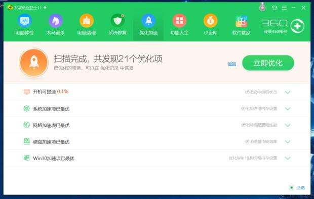 3、扫描完成后,点击“立即优化”,开始优化系统。