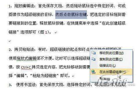 2、拷贝粘贴法:利用鼠标拖放法创建超链接很方便,但是有时超级链接的起点和终点在文档中相距较远,使用拖放式编辑的方法是很不方便的。这时可以选择超级链接的目标词、句或图像,按下Ctrl C复制选定内容,把光标移动到需要加入链接的位置,然后执行菜单“编辑→粘贴为超链接”即可(图2)。