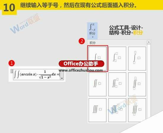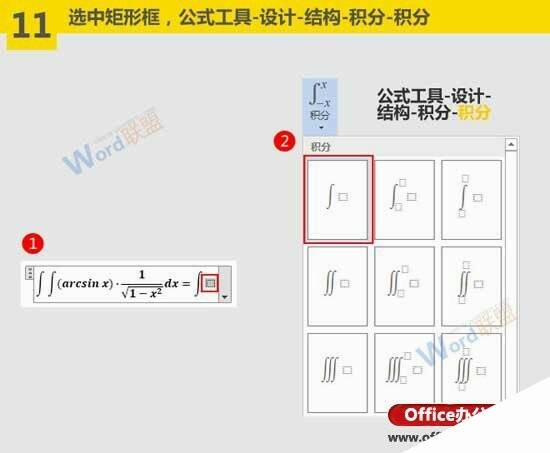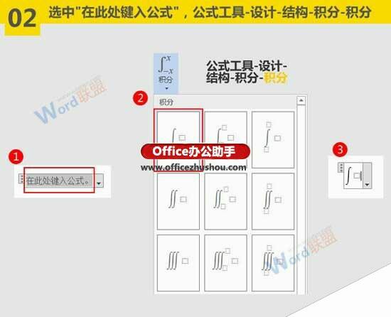 2、选中公式编辑框中的文字,进入“公式工具-设计”选项卡,在“结构”组中选择“积分”下的“积分”,公式编辑框中会出现如下图右侧的内容。