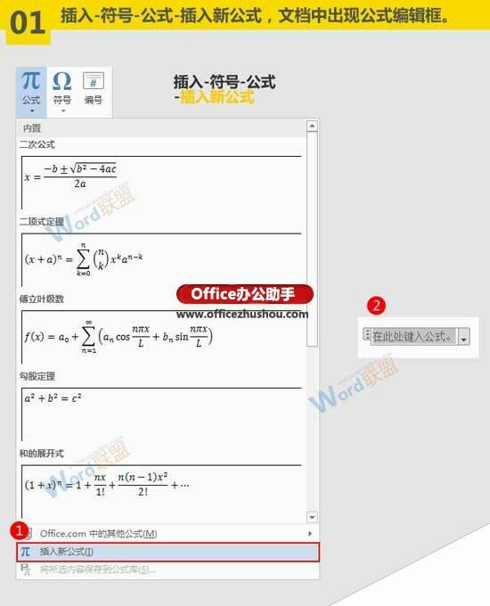 1、切换到“插入”选项卡的“符号”组,在“公式”下拉菜单中选择“插入新公式”,文档中就会出现如下图右侧所示的公式编辑框。