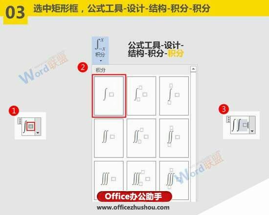 3、选中积分右侧的矩形框,继续在“公式工具-设计”选项卡中插入积分。