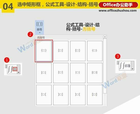 4、选中第二个积分符号右侧的矩形框,在“结构”组中找到“括号”,选择第一个方括号。