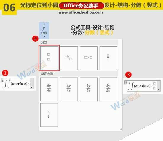 6、将光标定位到小圆点之后,在“结构”组中找到“分数”,选择“分数(竖式)”。