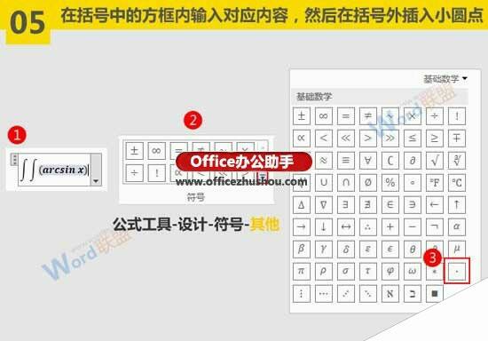 5、在括号中的方框内输入对应的内容,然后将光标定位在括号外,在“符号”组中单击“其他”按钮,选中小圆点符号。