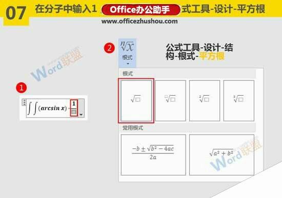 7、在分子的矩形框中输入1,然后选中分母上的矩形框,在“结构”组中找到“根式”,选择“平方根”。
