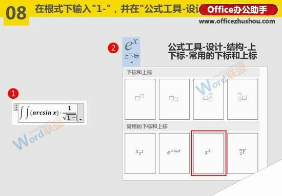 8、在根式下的矩形框中输入“1-”,然后在“结构”组中找到“上下标”,选择 x² 。