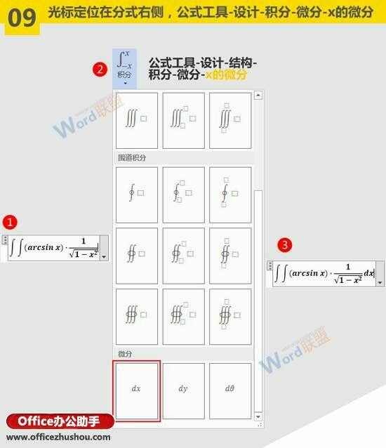 9、将光标定位到分式右侧,然后在“结构”组中找到“积分”,选择“x的微分”。