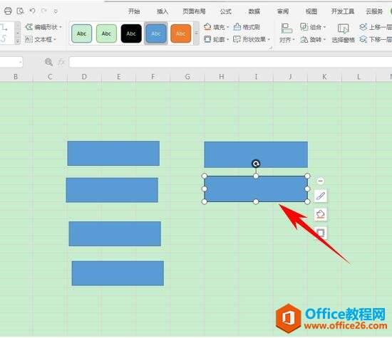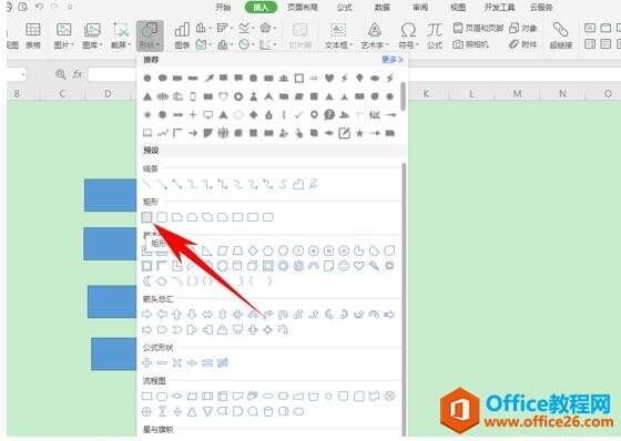 首先,我们先来看一下,如果我们直接添加形状,会遇到什么难题?单击工具栏插入下的形状,选择矩形,插入四个矩形。