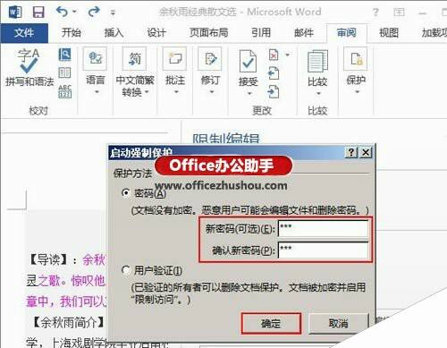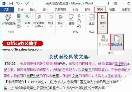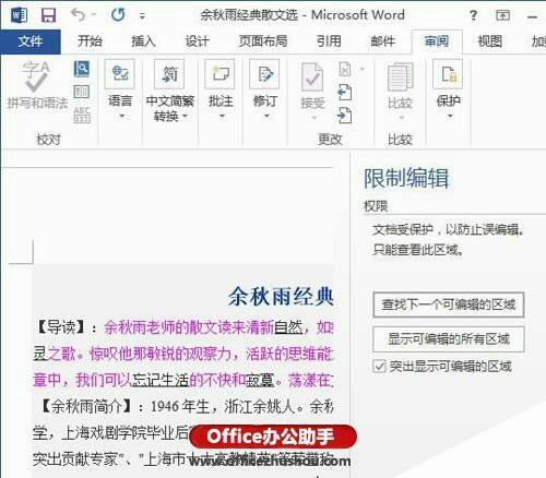 Office办公助手(www.officezhushou.com)提醒您:当我们自己想要修改文档内容的时候,又应该怎么办呢?大家可以参照《在Word2013中取消文档保护的方法》这篇文章。