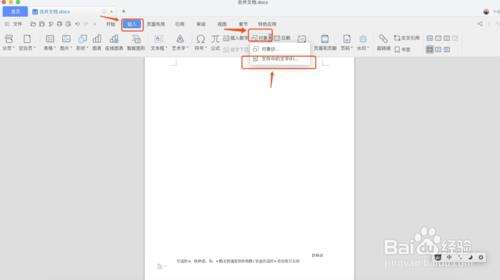 3、点击菜单栏中的“插入”—“对象”—“文件中的文字”