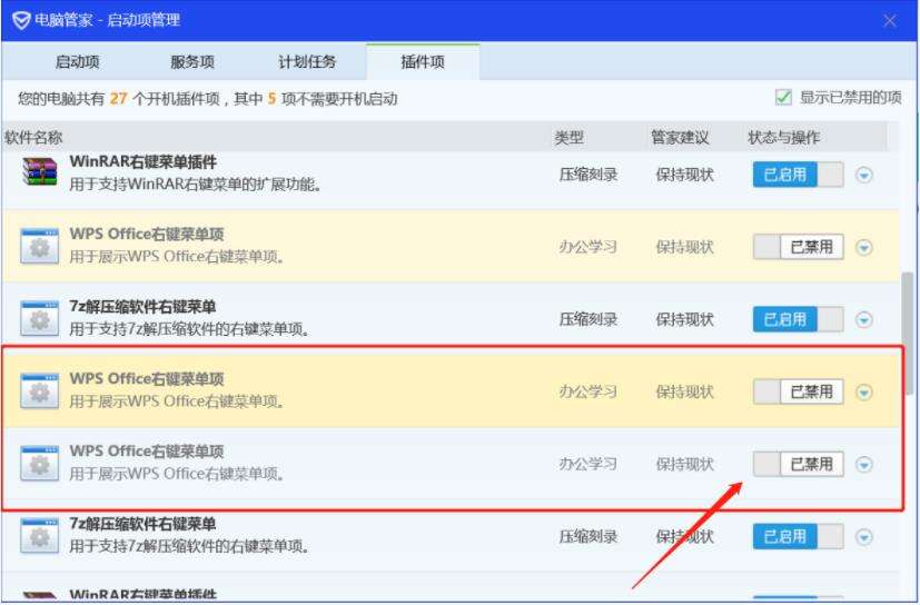 4)点击【已禁用】,确保【WPS Office右键菜单项】切换为【已启用】状态;
