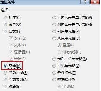 在定位条件界面中,勾选空值,确定。
