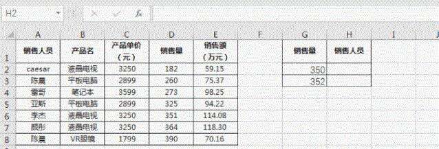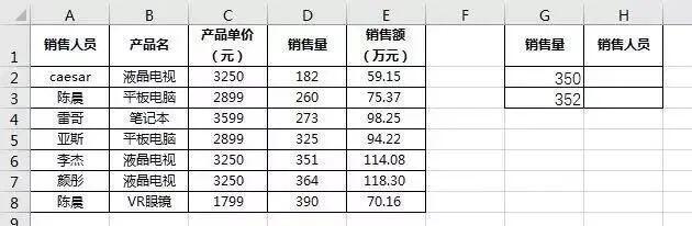假如需要求出销售量为350,352时,销售人员的姓名。